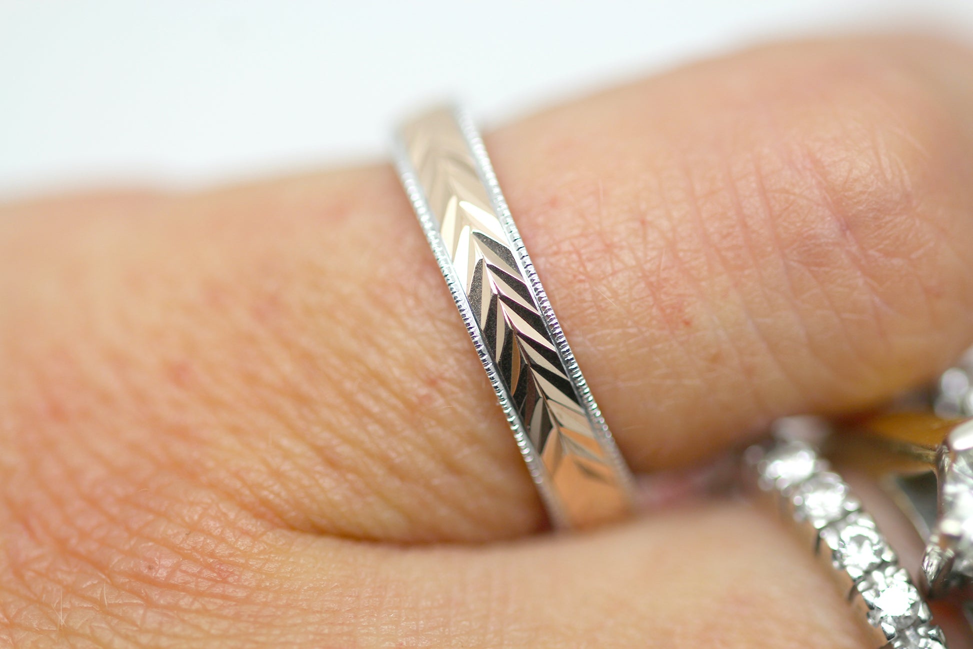 Explore our elegant 4mm gold wedding ring for women and men, crafted with a beautiful Wheat Inspired Design. This sophisticated ring features intricate nature inspired detailing, offering a perfect blend of modern and classic design elements. Faceted centre and beaded edges create a striking contrast, making it a unique and stylish choice for brides and grooms. Ideal for those seeking a timeless symbol of love and commitment, this wedding ring is designed to make your special day truly memorable. Perfect for men's wedding jewelry, men's engagement ring or men's anniversary ring gift. Quarter sizes available.